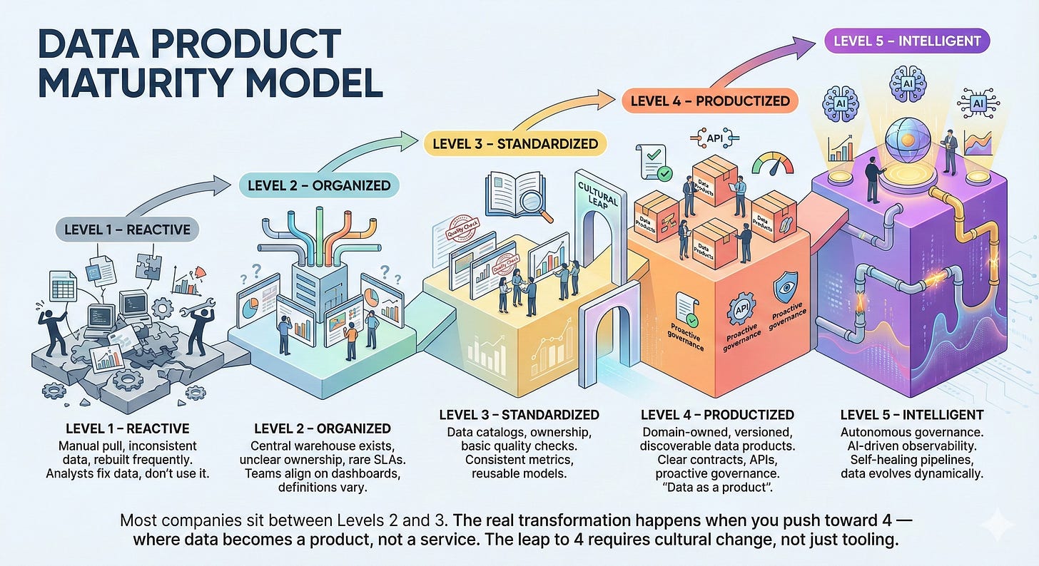 Most companies sit between Levels 2 and 3. The real transformation happens when you push toward 4 — where data becomes a product, not a service